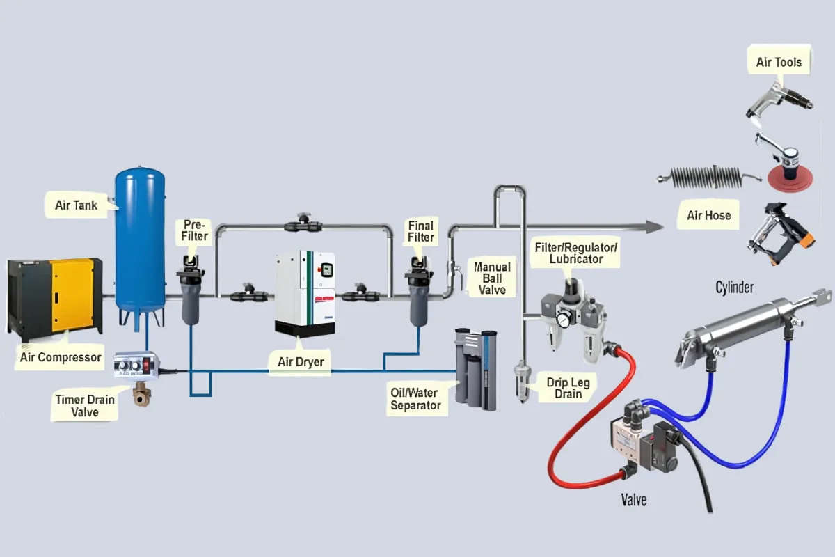 سیستم با کمپرسور هوا آغاز میشود که وظیفهاش تولید و فشردهسازی هوا است. این دستگاه هوای محیط را میگیرد و تحت فشار قرار میدهد تا برای استفاده در سیستم پنوماتیک آماده شود.